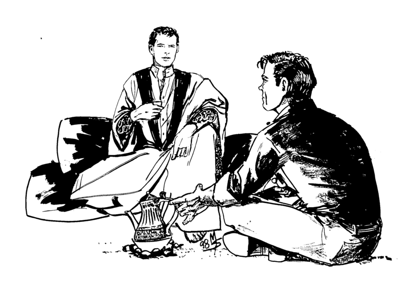 Moffitt took another glass from an exquisite tea service on the floor, filled it and handed it to Troy. Troy sniffed cautiously at the beverage. Moffitt grinned. "This is the good stuff. It's been boiled down at least four or five times, and there's several days' ration of sugar and mint in there as well. It's a good indication that our host thinks highly of us."