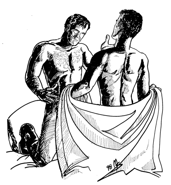 They quickly dispensed with the encumbrance of clothing, and Troy finally allowed himself to feast his eyes. He was not disappointed; though thin, Moffitt was wiry rather than bony, with a smooth layer of hard muscle under the well-tanned skin. Then Moffitt, putting his arms around Troy, pulled them both down to lie among the cushions.